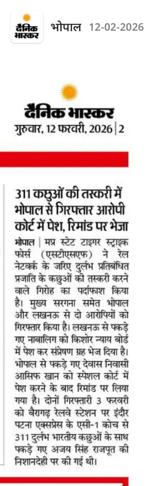 रेल नेटवर्क के जरिये दुर्लभ एवं प्रतिबंधित प्रजाति के कछुओं की तस्करी उत्तर प्रदेश से मध्यप्रदेश के विभिन्न शहरों में करने वाले गिरोह का पर्दाफाश
